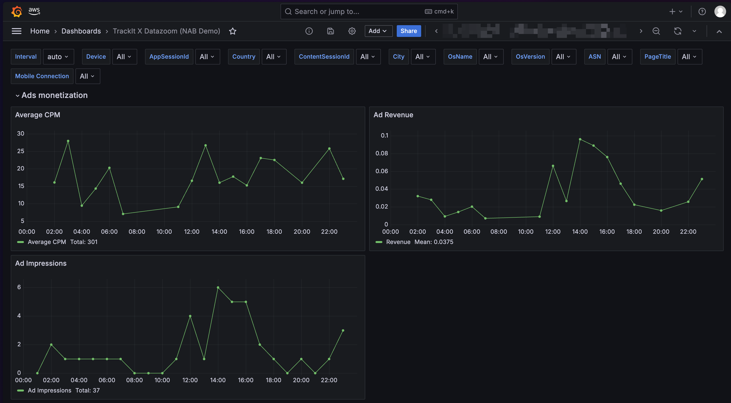 Leverage the Datazoom and TrackIt solution to transform raw ad insertion data into actionable business intelligence. Get immediate value from pre-built dashboards in AWS Managed Grafana, visualizing key metrics crucial for optimizing your ad strategy and maximizing revenue. This solution, integrating Datazoom’s specialized SSAI tracking for MediaTailor, provides: